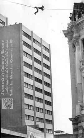 Maniboras del Cuerpo de Bomberos, paso de lancero hacia el Palacio Nacional. Cali. C. 1950.