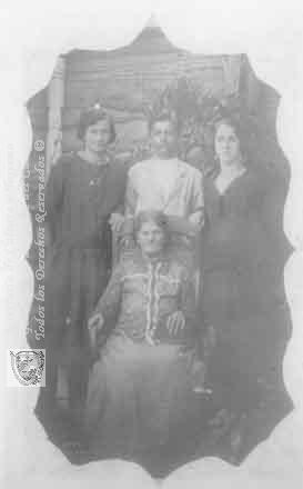 Sra Ocasal de Becerra e hijos. De pie Catalina Barrera O., Luis Carlos Barrera y María Antonia Gutiérrez de O, foto tomada en la casa de propiedad de Julio Ocasal, donde hoy se encuentra ubicado el Hotel Intercontinental. Cali. 1924.