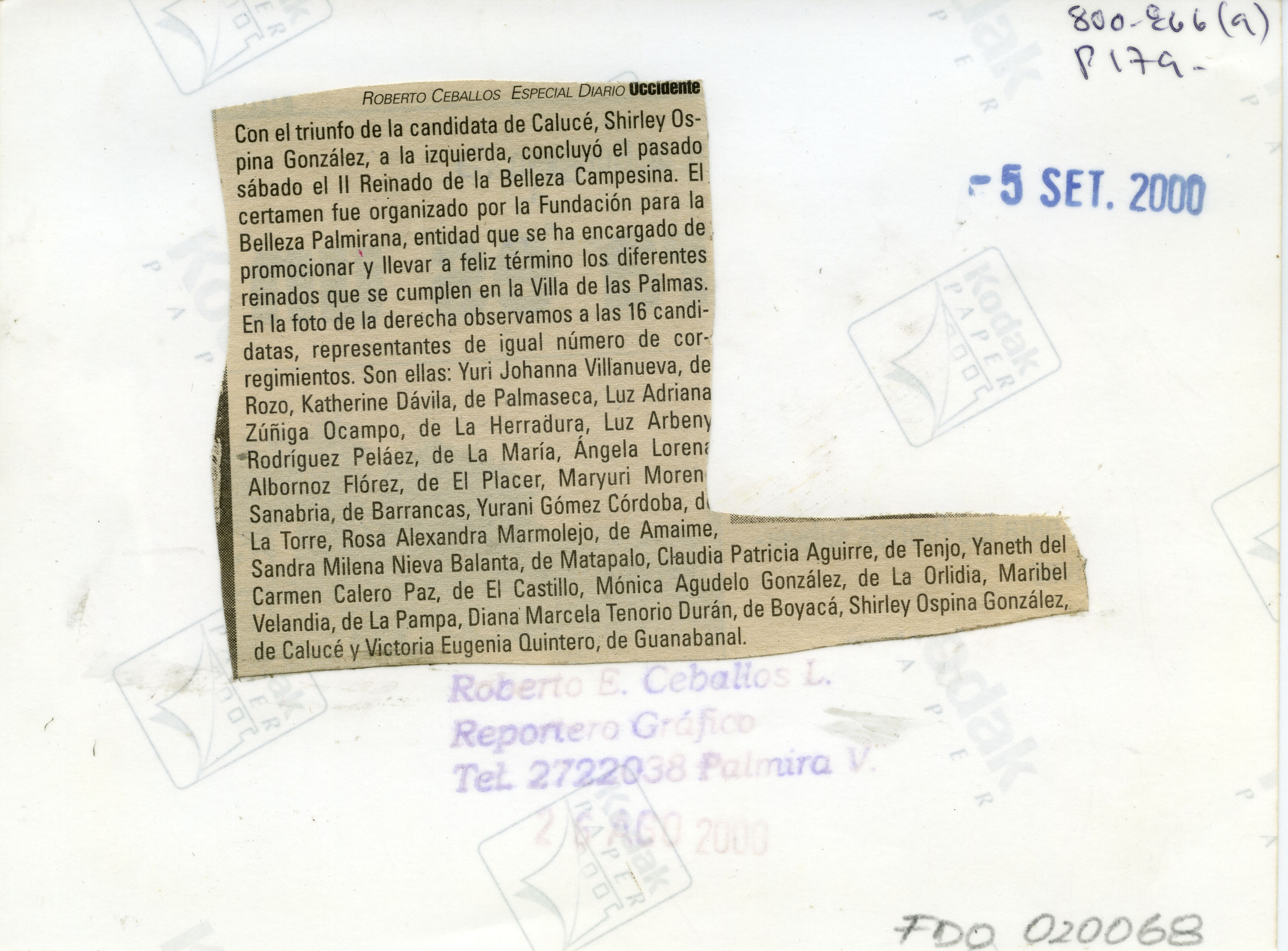 | dc.description.abstract | "Al reverso de la fotografía se anexa recorte:""Con el triunfo de la candidata de Calucé, Shirley Ospina González, a la izquierda, concluyó el pasado sábado el II Reinado de la Belleza Campesina. El certamen fue organizado por la Fundación para la Belleza Palmirana, entidad que se ha encargado de promocionar y llevar a feliz término los diferentes reinados que se cumplen en la Villa de las Palmas. En la foto de la derecha observamos a las 16 candidatas, representantes de igual número de corregimientos. Son ellas: Yuri Johanna Villanueva, de Rozo, Katherine Dávila, de Palmaseca, Luz Adriana Zúñiga Ocampo, de La Herradura, Luz Arbeny Rodríguez Peláez, de La María, Angela Lorena Albornoz Flórez, de El Placer, Maryuri Moreno Sanabria, de Barrancas, Yurani Gómez Córdoba, di La Torre, Rosa Alexandra Marmolejo, de Amaime, Sandra Milena Nieva Balanta, de Matapalo, Claudia Patricia Aguirre, de Tenjo, Yaneth del Carmen Calero Paz, de El Castillo, Mónica Agudelo González, de La Orlidia, Maribel Velandia, de La Pampa, Diana Marcela Tenorio Durán, de Boyacá, Shirley Ospina González, de Calucé y Victoria Eugenia Quintero, de Guanabanal.""" | spa |