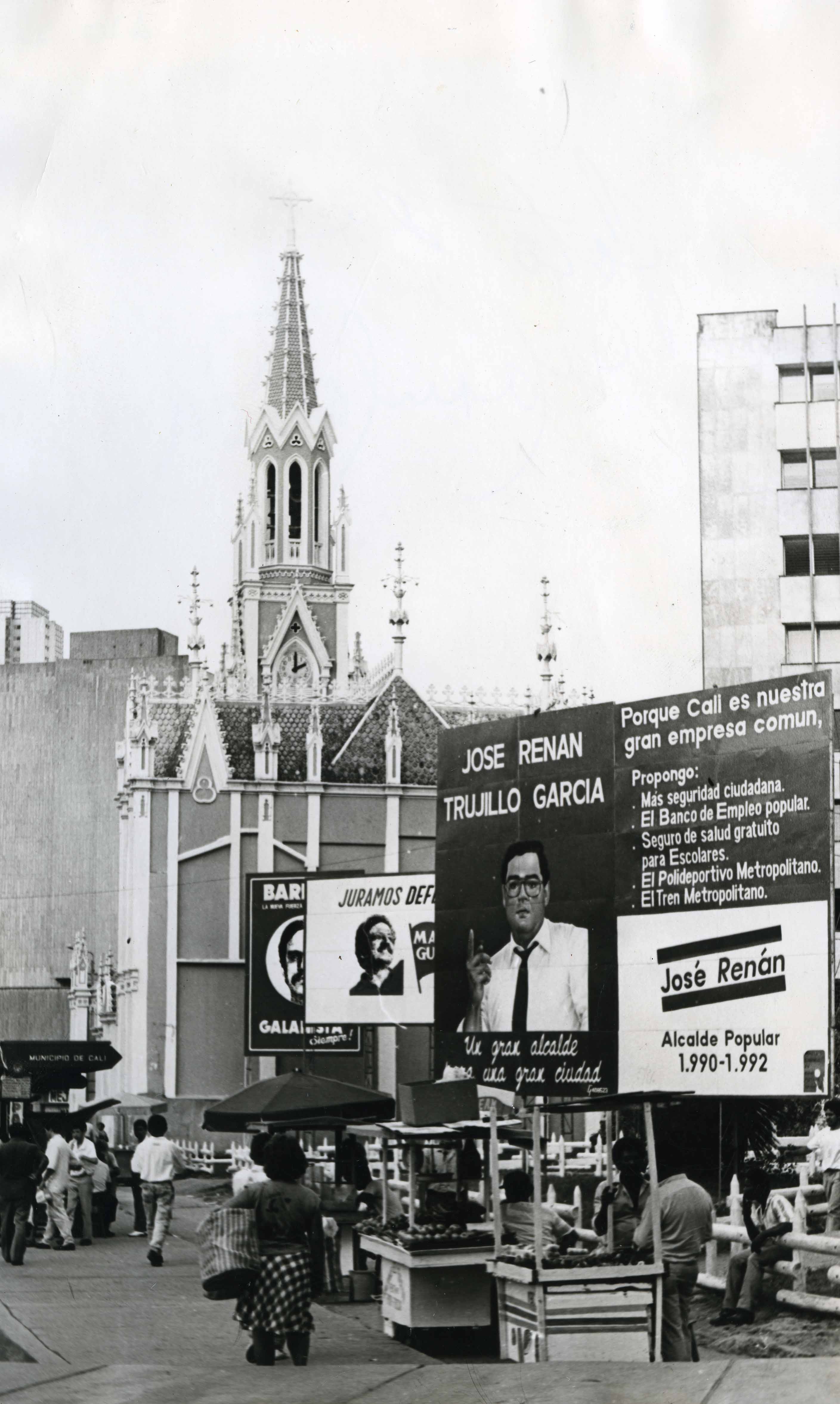 Comercio informal y campañas políticas en las proximidades de la Ermita, Cali.- El Archivo del Patrimonio Fotográfico y Fílmico del Valle del Cauca es responsabilidad de la Biblioteca Departamental del Valle Jorge Garcés Borrero, por convenio de cooperación suscrito con la Secretaria del Cultura Departamental, con el fin de aunar esfuerzos para su conservación, preservación y divulgación del Archivo entre la comunidad Vallecaucana, especialmente entre los estudiantes e investigadores que visitan la Biblioteca, propiciando el su uso y consulta permanente. La universidad Icesi es un colaborador en el proceso de difusión, facilitando la tecnología que permite la consulta de las imágenes.