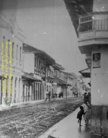 Calle principal, de Sevilla, sin pavimentar. El segundo edificio al lado izquierdo en la foto es la sede del banco de Colombia y contiguo el banco de Bogotá. C. 1960