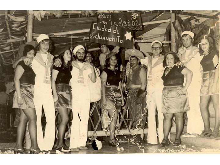 Concurso de comparsas en el Colegio Alemán. Se observa en la fotografía la comparsa "Ciudad de Juanchito" integrada por miembros de la familia Buttrus y Vives. Santiago de Cali, 1973