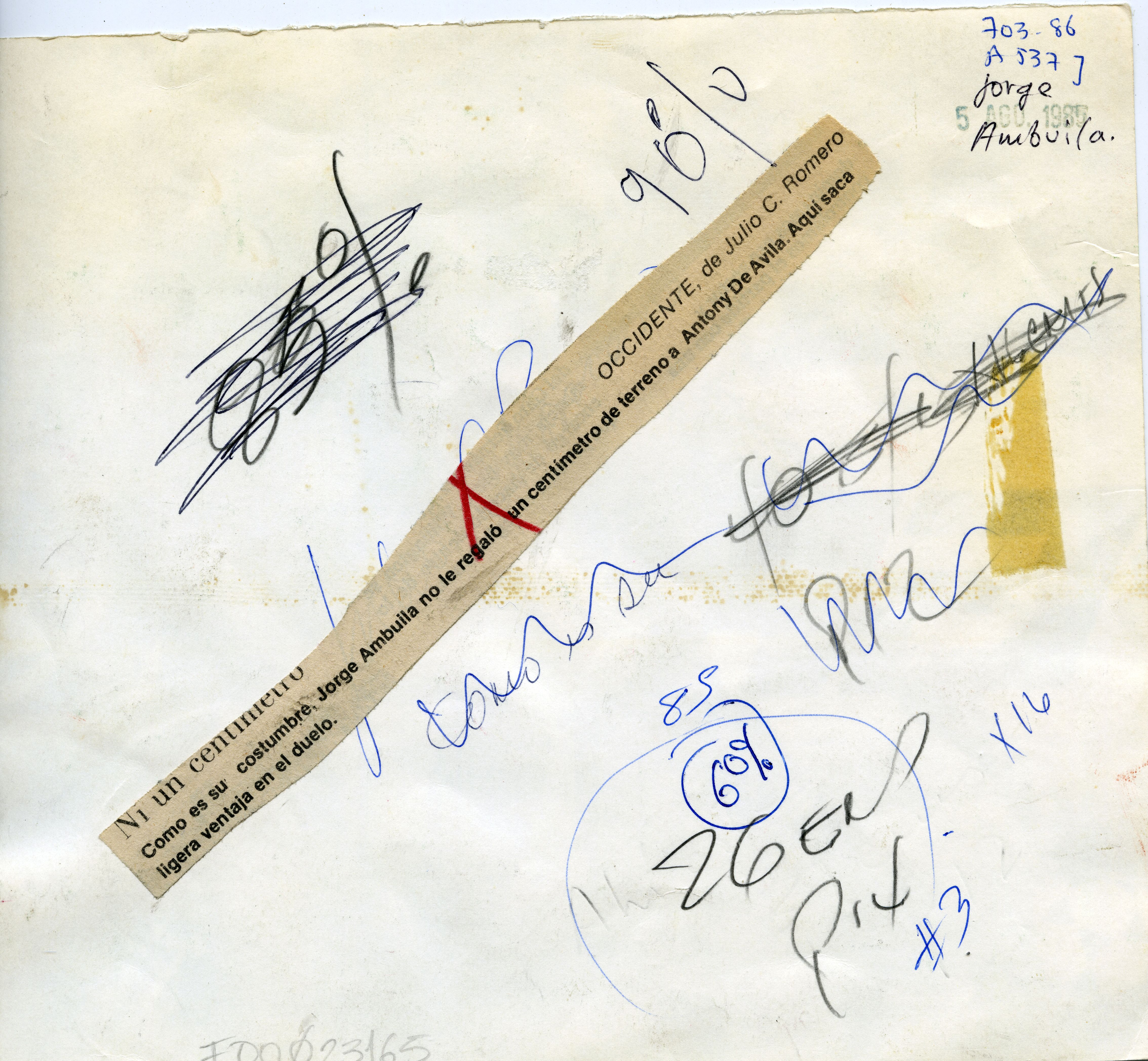 Al reverso de la fotografía se anexa recorte: Como es su costumbre, Jorge Ambuila no le regaló un centímetro a Anthony De Ávila. Aquí saca ligera ventaja en el duelo