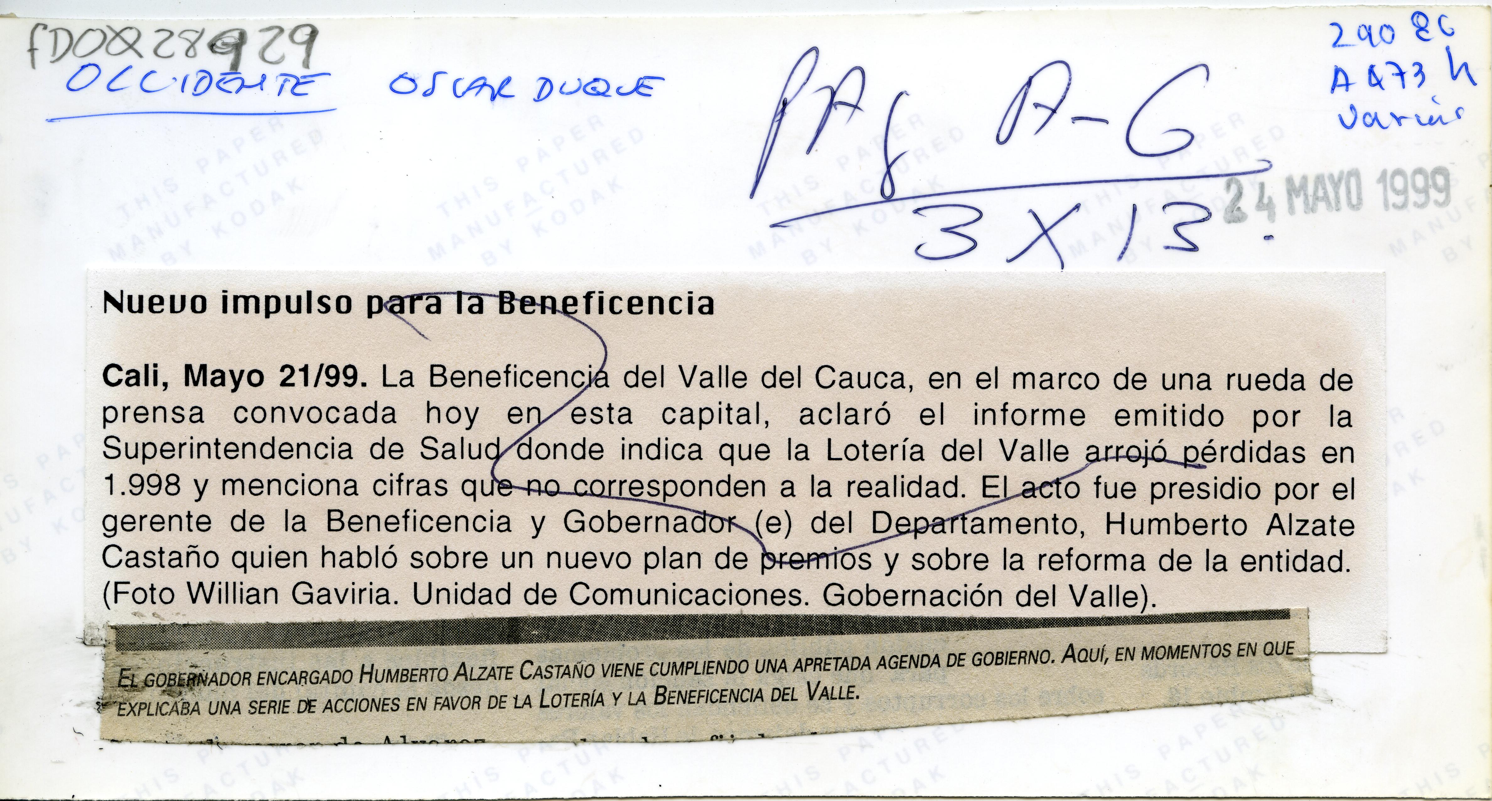 Reverso,"Nuevo impulso para la beneficencia. Cali, mayo 21/99. La Beneficencia del Valle del Cauca, en el marco de una rueda de prensa convocada hoy en esta capital, aclaró el informe emitido por la superintendencia de salud donde indica que la lotería del valle arrojó pérdidas en 1998 y menciona cifras que no corresponden a la realidad. El acto fue presidido por el gerente de la beneficencia y gobernador del departamento , Humberto Alzate Castaño quien habló sobre el nuevo plan de premios y sobre la reforma de la entidad.- El Gobernador encargado Humberto Alzate Castaño viene cumpliendo una apretada agenda de gobierno. Aquí, en momentos en que explica una serie de acciones en favor de la lotería y la beneficencia del valle."