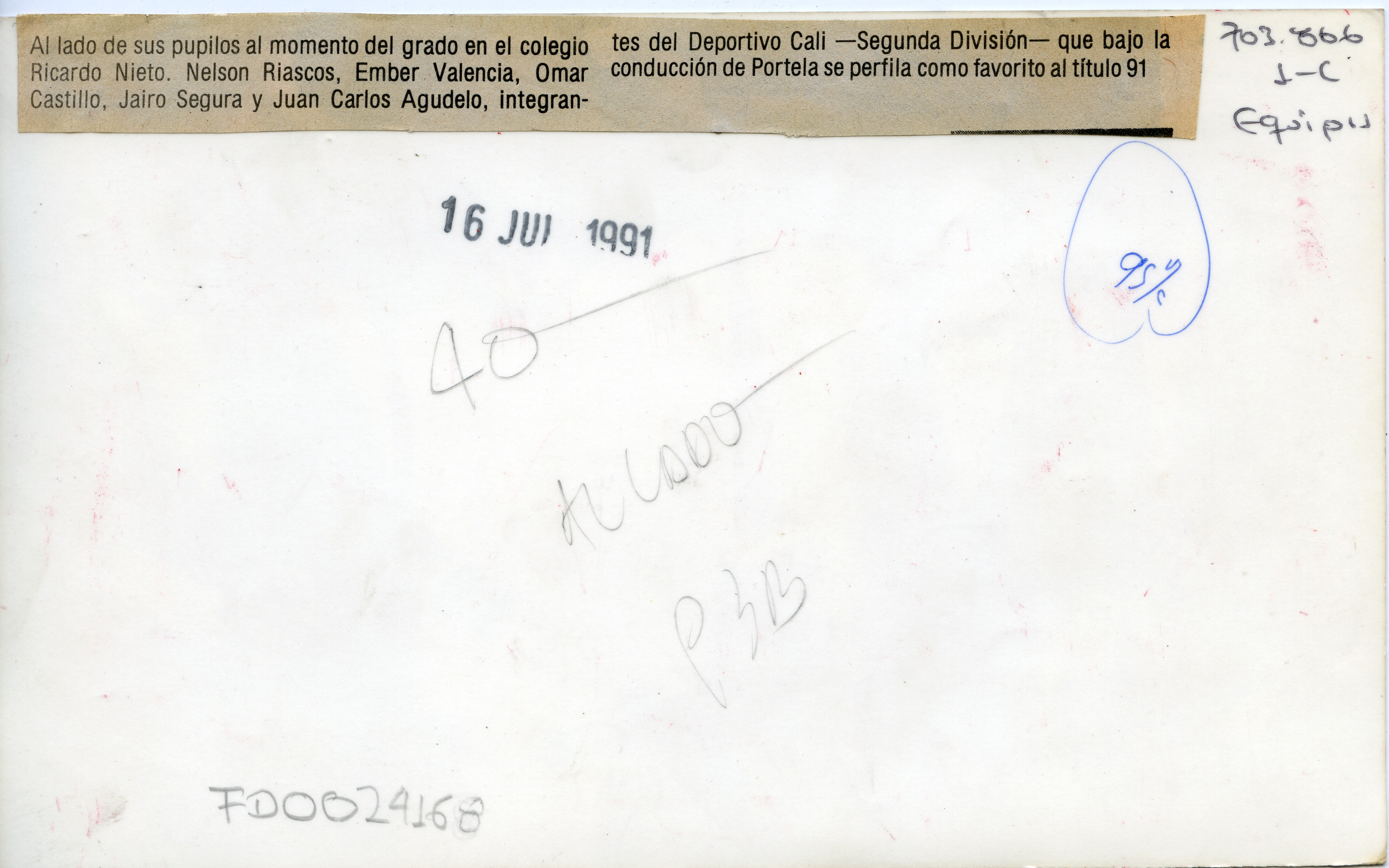 | dc.description.abstract | Al lado de sus pupilos al momento del grado en el colegio Ricardo Nieto. Nelson Riascos, Ember Valencia, Omar Castillo, Jairo Segura y Juan Carlos Agudelo. Integrantes del Deportivo Cali - segunda división - que bajo la conducción de Portela se perfila como favorito al título 91 | spa |