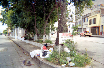 Plano general. Calle con pequeño parque. Bolsas de basura depositadas en el lugar donde irónicamente está prohibido hacerlo.