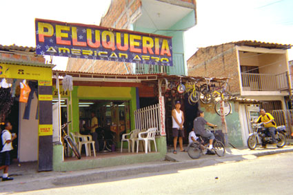 Bueno, F. A. (2005). Imagen tomada en exterior, donde se destaca una peluquería con un aviso muy notorio en la parte superior. Santiago de Cali: Biblioteca Departamental Jorge Garces Borrero.
