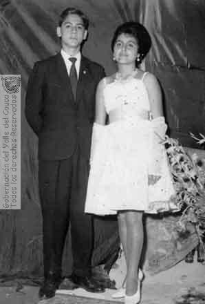 Señorita Fanny Cecilia Tascón, princesa de las ferias populares y su edecán Jorge Alvarado. San Pedro. 1963.