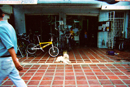 Plano Medio. En la imagen se puede apreciar la fachada de un local comercial, donde funciona un taller de bicicletas, en el centro de la imagen se aprecia un perro de color blanco con un moño rojo mirando hacia la cámara y acostado sobre el piso de baldosas rojas. Al extremo izquierdo un hombre transita por la acera.