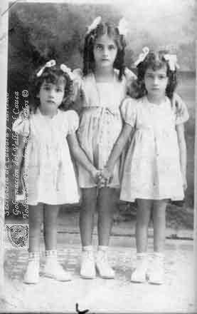 Las hermanas Sonia, Lupe y Maritza Quintero Zapata, luciendo vestidos de talle alto y peinados con crespos, era muy usual vestir y peinar a las niñas de esta manera