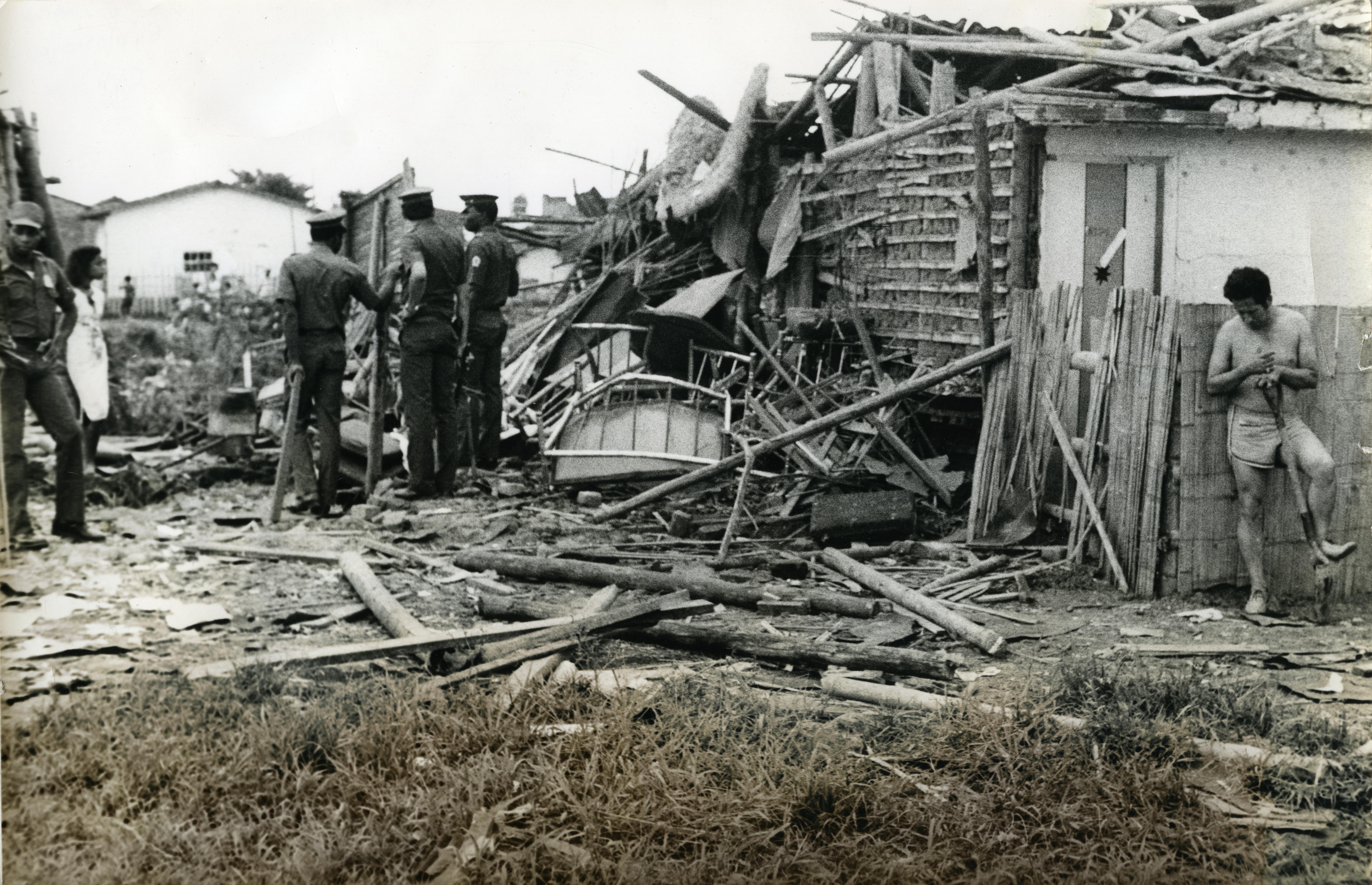 En la gráfica se observan algunas casas destruidas a causa de una explosión. Se observa a la policía y algunas personas en la escena.