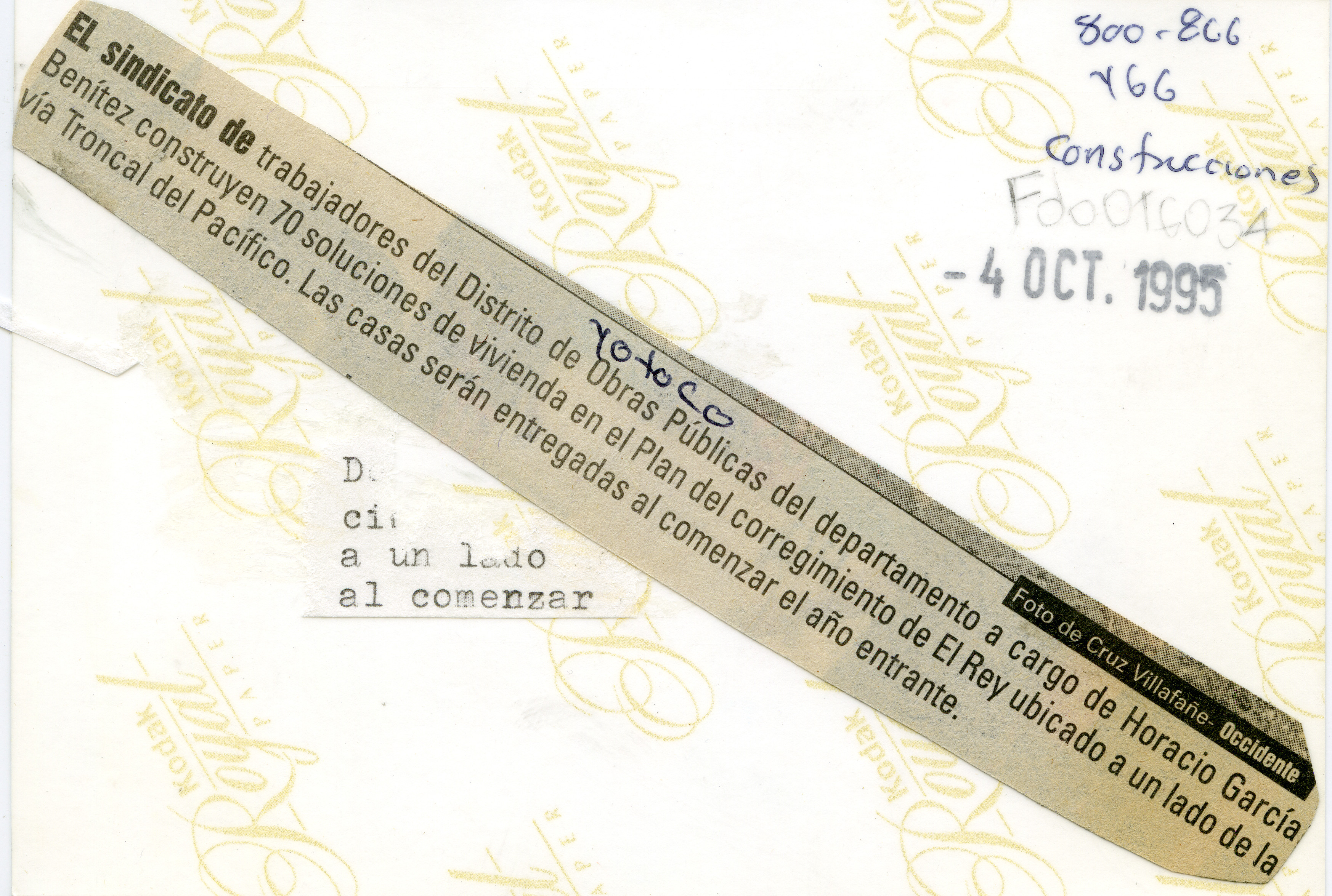 Al reverso de la fotografía se anexa un recorte: " El sindicato de trabajadores del Distrito de Obras Públicas del departamento a cargo de Horacio García Benítez construyen 70 soluciones de vivienda en el Plan del corregimiento del El Rey ubicado a un lado de la Vía Troncal del Pacífico. las casas serán entregadas al comenzar el año entrante."