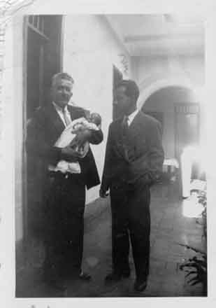 Javier Victoria Zuñiga, Eduardo Victoria González y la niña Socorro Victoria. Barrio Bretaña, Santiago de Cali, 1948.