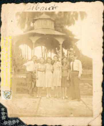 Libardo Arias, Julieta Escibar, Mary Gangoly Bejarano y Flor Rojas Q., en el parque central, detrás la rotonda. Bugalagrande. C. 1927.