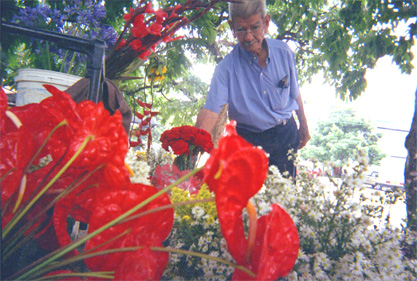 En primerísimo primer plano imagen de anturios rojos en lateral izquierdo inferior. En el medio un adulto mayor observa las flores. La vegetación es variada y ocupa todo el campo de la imagen.