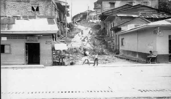 ANIBAL OCORO (1950). Calle Valencia, avenida colateral más importante del barrio Pueblo Nuevo; al centro y hacia el fondo de la foto tenemos la subida a la "rolojera" y el restaurante "Carapacho" & 604085. BUENAVENTURA: Biblioteca Departamental Jorge Garces Borrero.