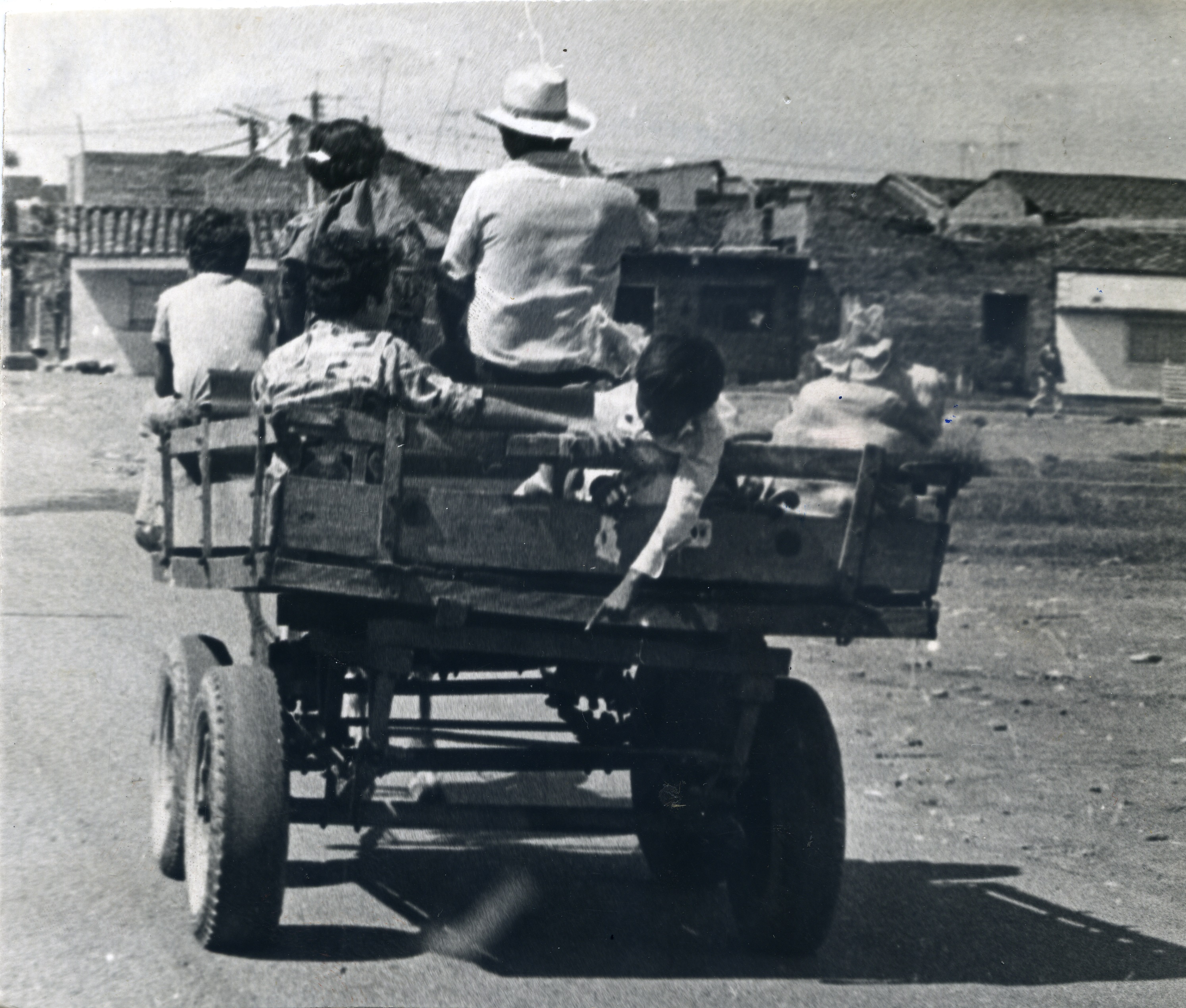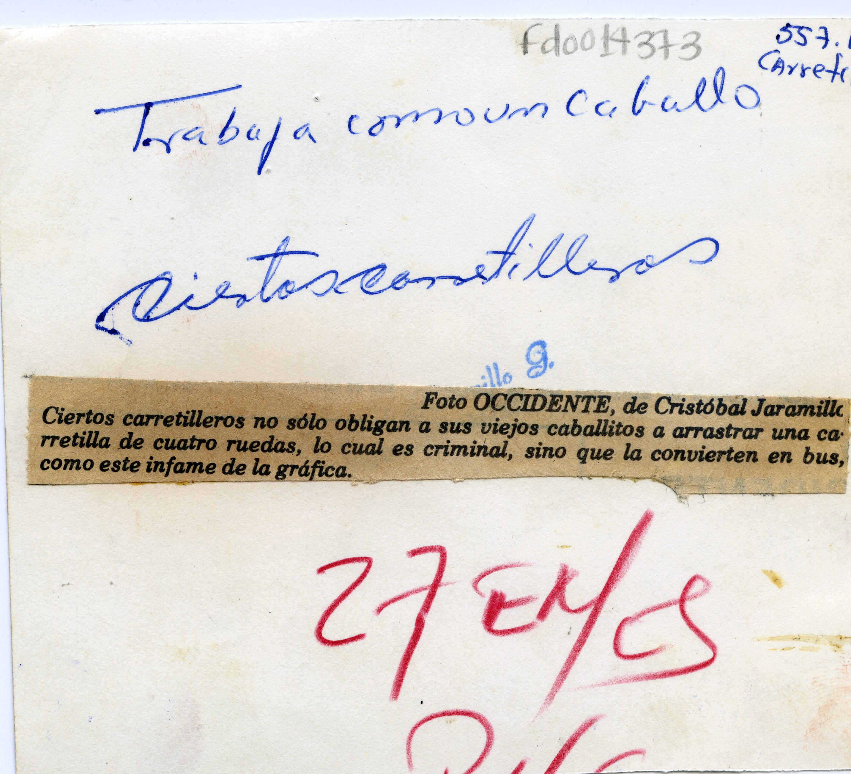 Al reverso conserva el pie de foto del periódico y dice lo siguiente: "Ciertos carretilleros no sólo obligan a sus viejos caballitos a arrastrar una carretilla de cuatro ruedas, lo cual es criminal, sino que la convierten en bus, como este infame de la gráfica." Se observa la parte trasera de una carretilla transportado a dos adultos y tres menores de edad.