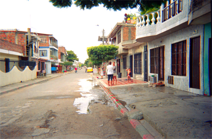 Calle de barrio en la cual se observan dos señoras conversando en acera