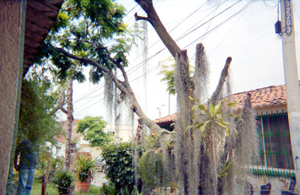 Plano medio. Exterior día. Perspectiva de barrio, donde resalta tronco con peluza como punto distintivo, frente a hombre que se camufla entre vegetación en primer plano.