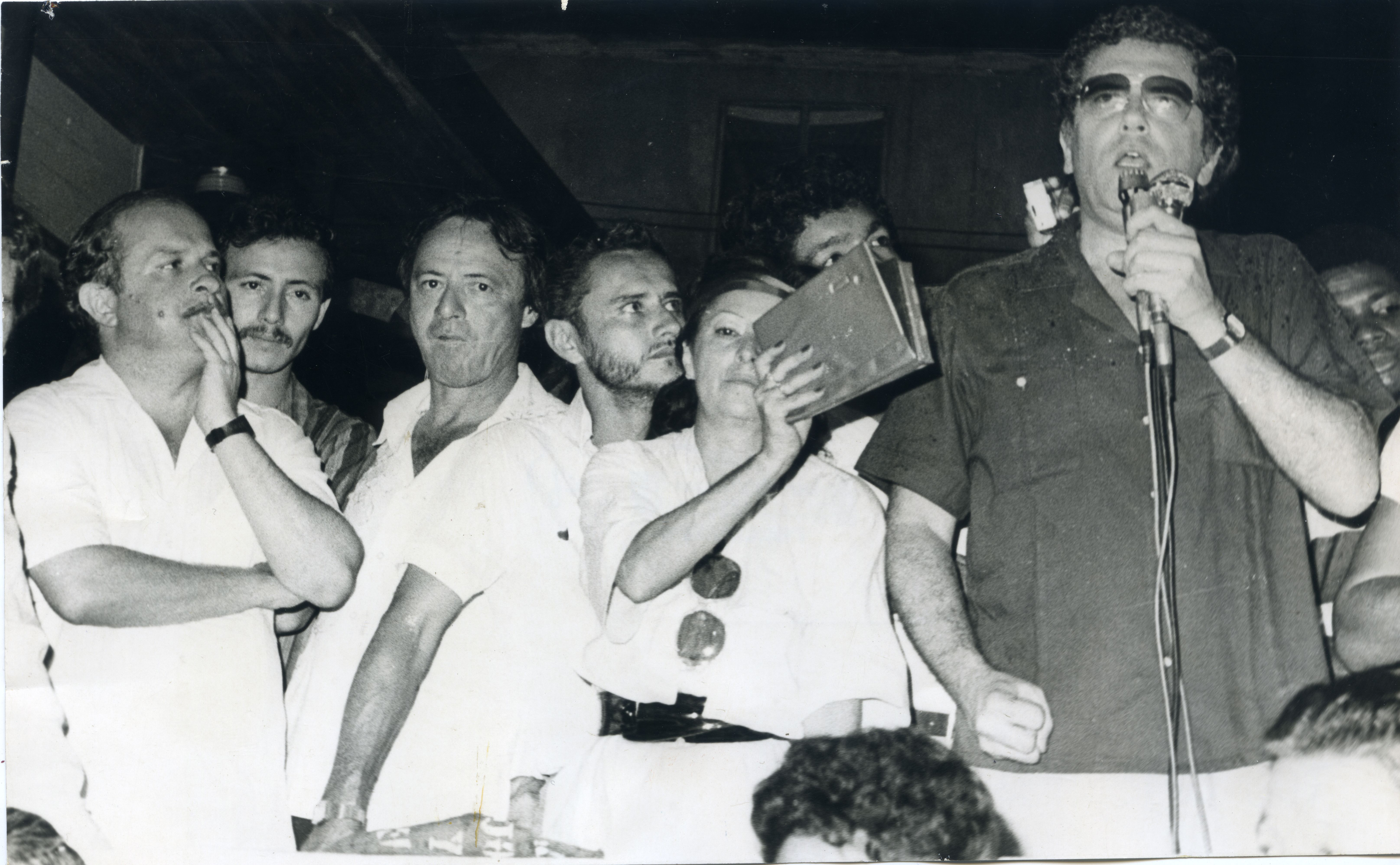 Fotografia de plano completo de Carlos Holguin Sardi, donde se ve con un microfono en su mano izquierda, esta vestido de camisa manga corta, tiene anteojos, a su lado derecho se puede ver una mujer serca de él y más alla a muchas más personas