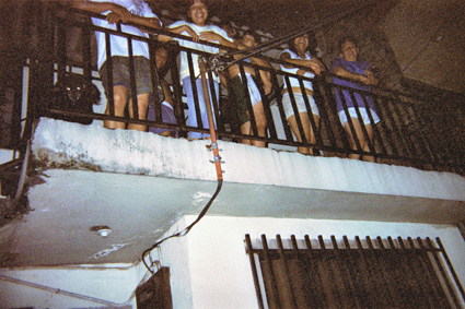 | dc.description | Plano medio, contra picado, donde se destaca una franja horizontal de color blanco. Arriba un grupo de jóvenes mirando desde la baranda de un balcón hacía la cámara. En el extremo inferior parte de una ventana con una reja de color café. Imagen tomada con flash. | spa |