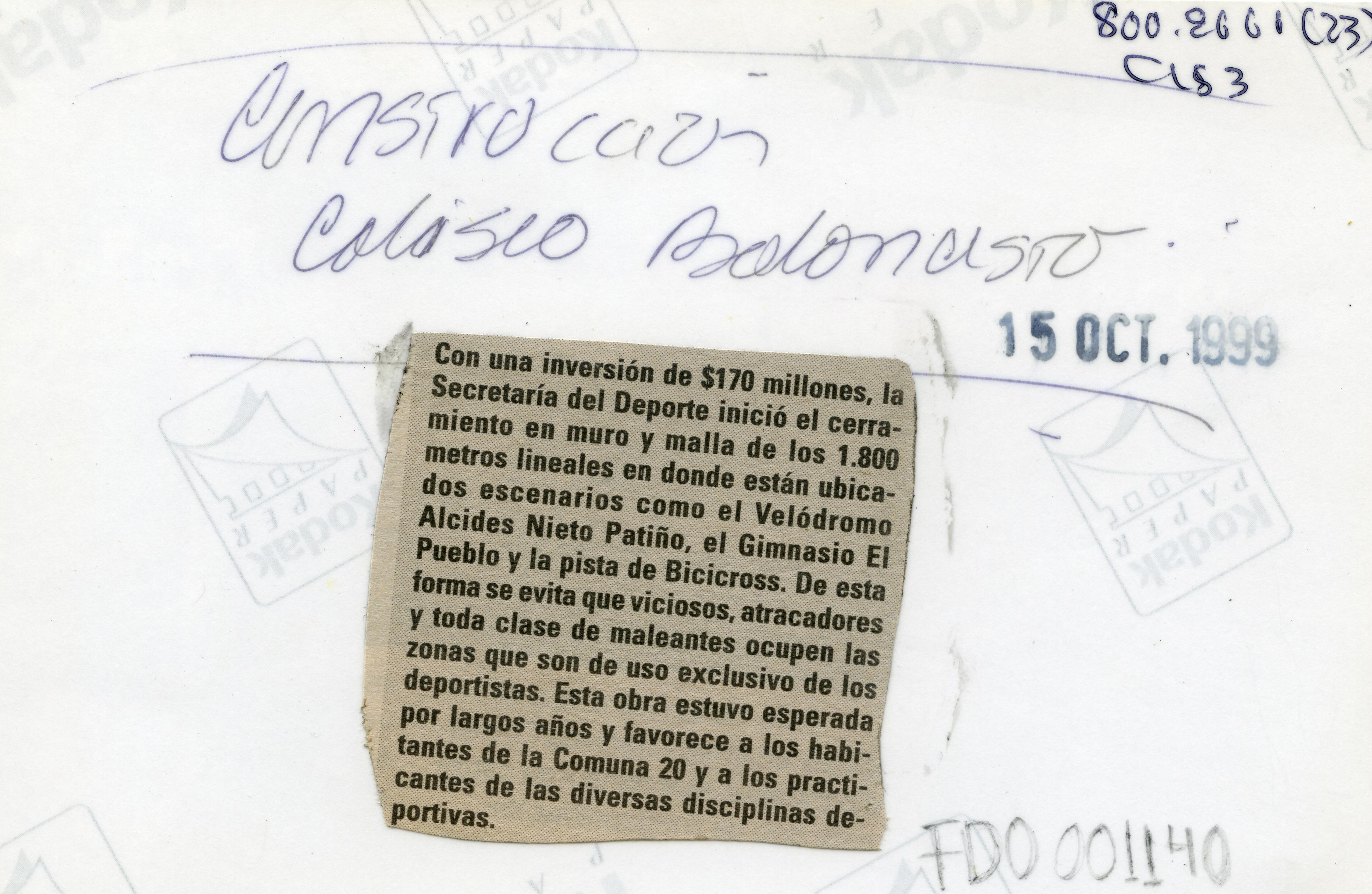 Al reverso de la fotografía se anexa un recorte. "Con una inversion de $ 170 millones,la Secretaría del Deporte inició el cerramiento en muro y malla de lo 1.800 metros lineales en donde están ubicados escenarios como el Velódromo Alcides Nieto Patiño, el Gimnasio El Pueblo y la pista de Bicicrros. De esta forma se evita que viciosos, atracadores y toda clase de maleantes ocupen las zonas que son de uso exclusivo de los deportistas. Esta obra estuvo esperada por largos años y favorece a los habitantes de la Comuna 20 y a los practicantes de las diversas disciplinas deportivas."
