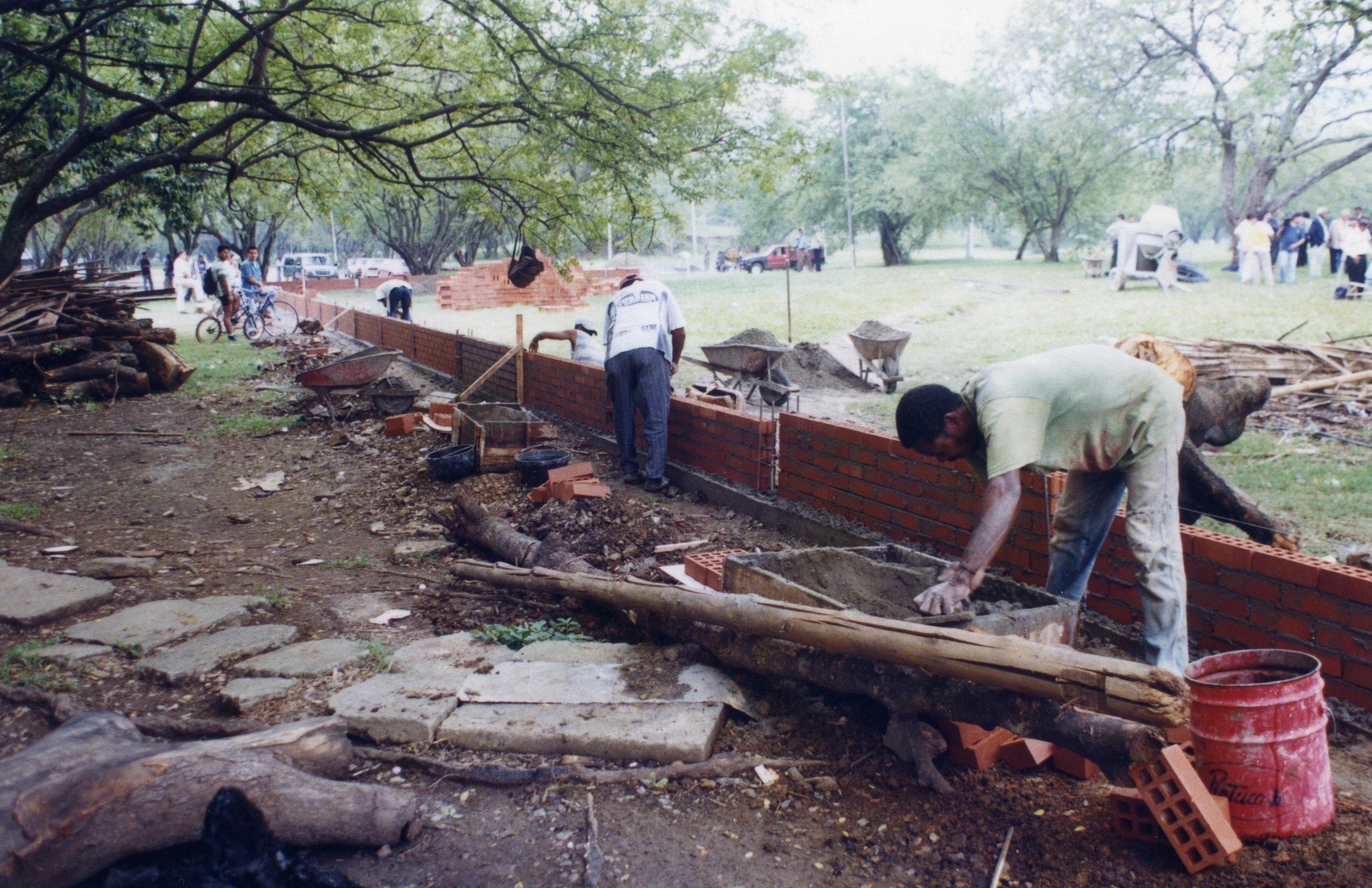 Obra pública en el coliseo del pueblo de enmallado para escenarios deportivos, se observa trabajadores construyendo en zona verde de dicho coliseo.