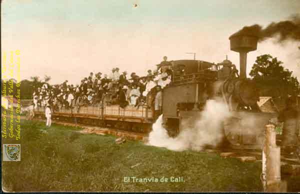 El tranvía de Cali, surgió al lado de la navegación a vapor por el río Cauca, por la lejanía de Puerto Mallarino. Se establece así una empresa de coches, inicialmente la cual fue reemplazada en 1910 por un tranvía; las calderas de sus locomotoras eran alimentadas con leña que se recogía en la Estación del Troncal. A partir de 1923 empezó a ser desplazado por los automóviles y buses de servicio urbano. Santiago de Cali, 1920.