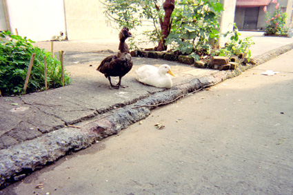 Plano medio de una vía pavimentada que define una diagonal hacia la derecha, junto a ella un andén sobre el cual hay dos patos, uno de color blanco echado sobre el suelo y otro de color negro de pie junto al blanco. Se pueden ver algunas jardineras con maleza.