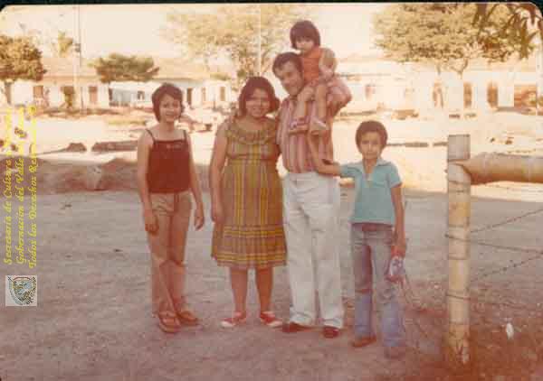 Fotografía familiar donde se aprecia la moda de la época y de fondo las casas del pueblo