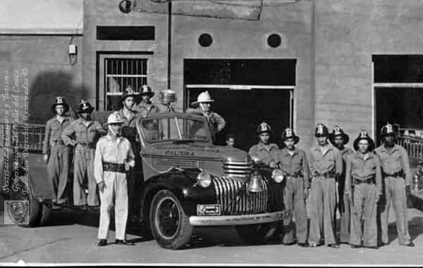 Cuerpo de bomberos de Palmira en 1945, con el uniforme y vehículo de la época.