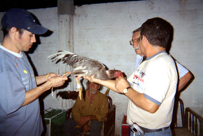 Plano medio. Interior, noche en la gallera. Perfil de hombres en laterales sosteniendo un gallo. Hombre sentado de