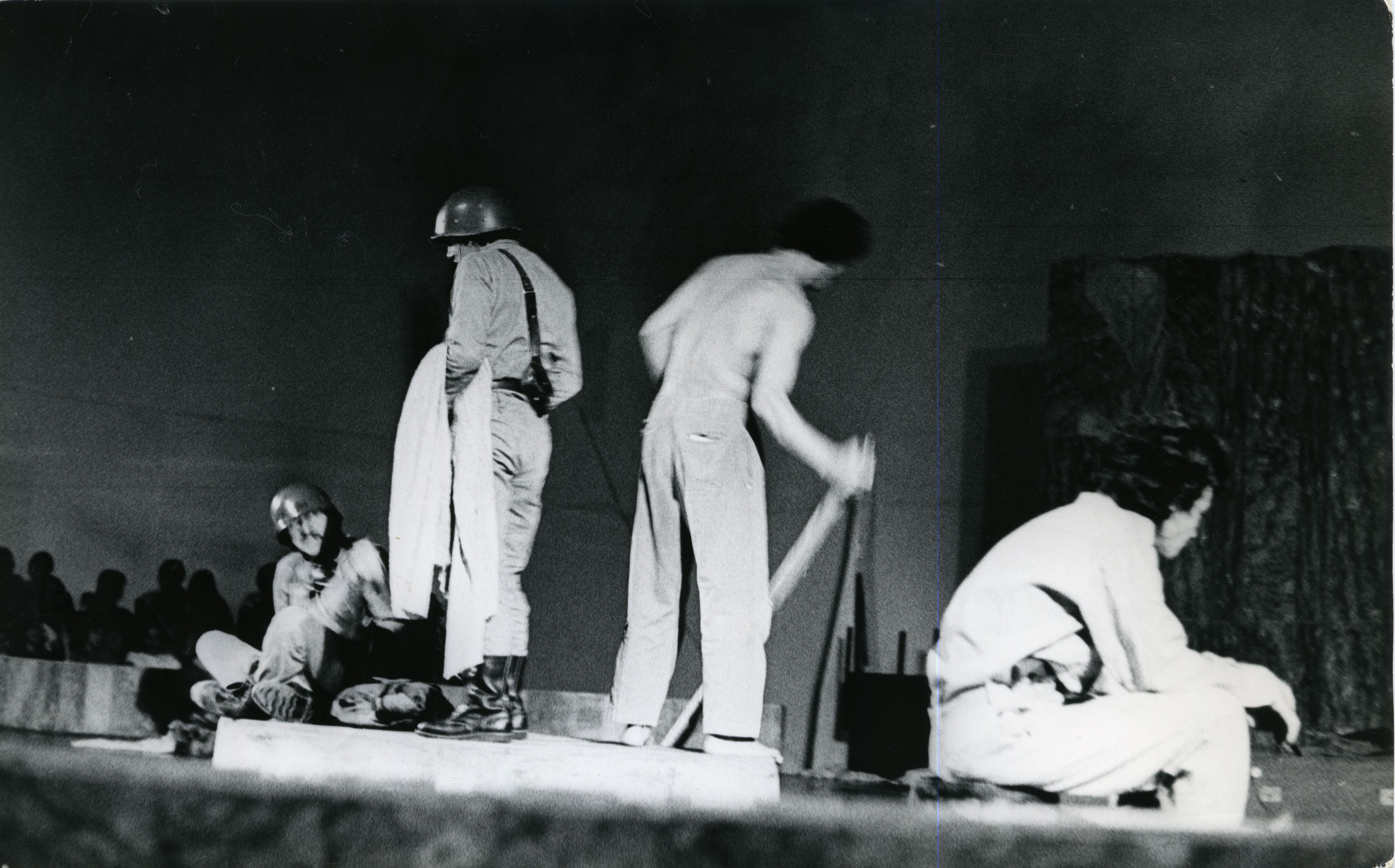 Teatro Experimental de Cali, Enrique Buenaventura. En escena los actores en el Centro Administrativo Municipal. Se aprecia obra de teatro