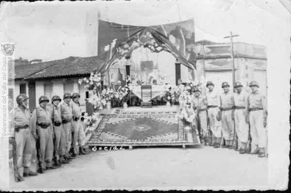 Celebración de la fiesta de La Virgen del Carmen. Altar custodiado por los bomberos. Trujillo, C. 1960.