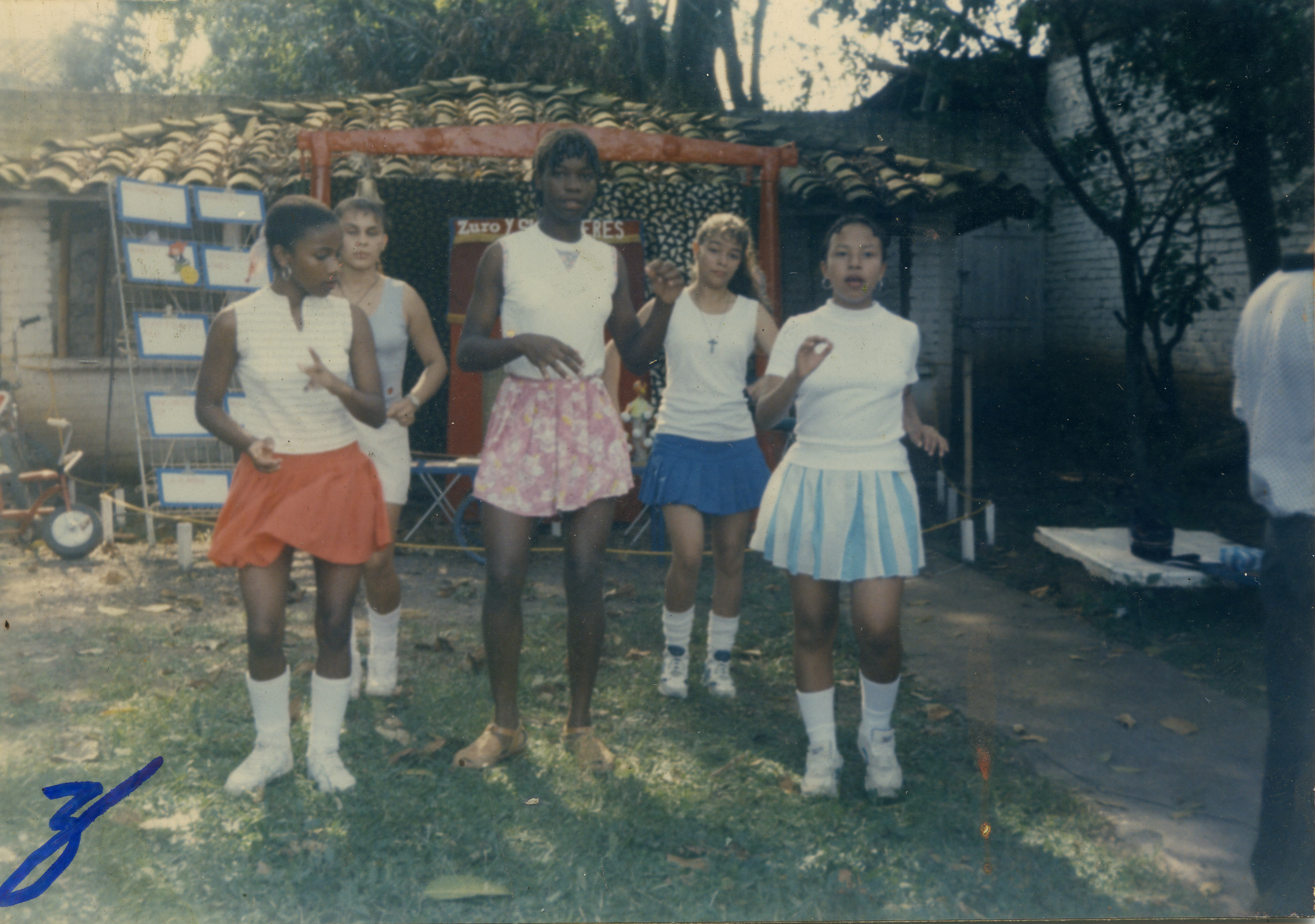Un grupo de cinco mujeres bailarinas ensayando salsa en el solar de la casa. Esta fotografía fue donada por el famoso historiador Zuro, en Jamundí, abril 13 de 2016