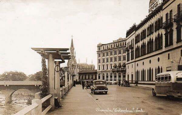 Registro fotográfico de la Cali antigua aproximadamente en la decada de 1930, se aprecia el río Cali, Puente Ortiz y Vehículos antiguos, Iglesia La Ermita