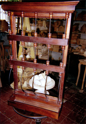 Primer plano. Reja con artesanías. En segundo plano artículos en madera. Marco captura el objetivo de la imagen.