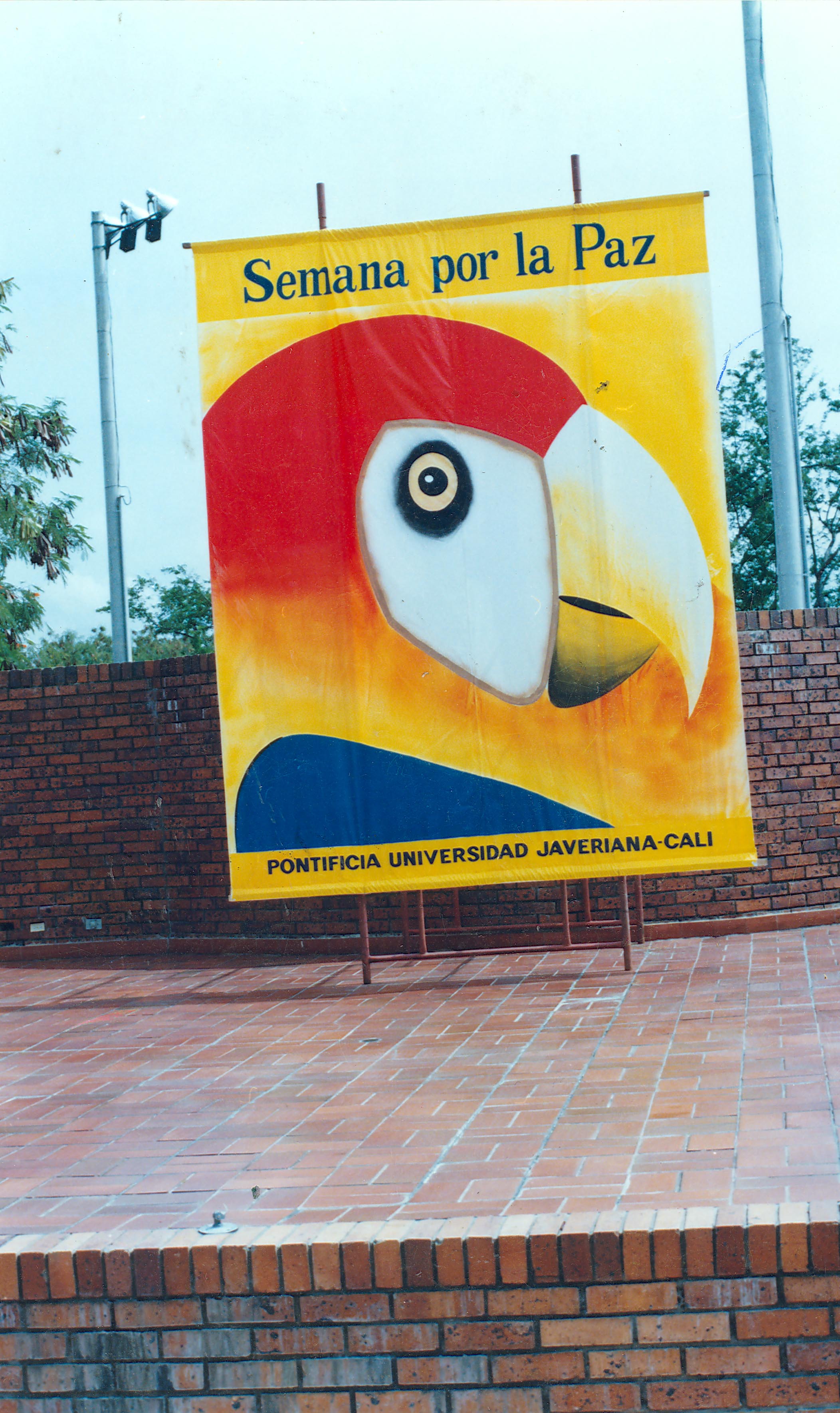 Valla con mensaje sobre la paz, en el marco del encuentro de la Comisión de Conciliación Nacional. // El Archivo del Patrimonio Fotográfico y Fílmico del Valle del Cauca es responsabilidad de la Biblioteca Departamental del Valle Jorge Garcés Borrero, por convenio de cooperación suscrito con la Secretaría de Cultura Departamental, con el fin de aunar esfuerzos para su conservación, preservación y divulgación del Archivo entre la comunidad Vallecaucana, especialmente entre los estudiantes e investigadores que visitan la Biblioteca, propiciando su uso y consulta permanente. La universidad Icesi es un colaborador en el proceso de difusión, facilitando la tecnología que permite la consulta de las imágenes.