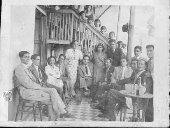 Familiares y amigos departiendo en reunión familiar, una costumbre de las familias numerosas de la región. Entre los invitados: De izquierda a derecha: Agustin Sarria, Zoximo Rojas, Herminia Millán, Argemiro Escobar, Rosa Lina Millán, Jorge Rodriguez P. Ramón Vidarte, Luis Carlos Palomino, Eloy Rodriguez, Eduardo Cruz, Luis Velez, Hermelinda Tamayo, Delfina Mejía, Olga Victoria, Aida Mondragón, Margarita Mejía, Lucia Rodriguez, niñas en la escalera. La Unión, fecha por identificar.