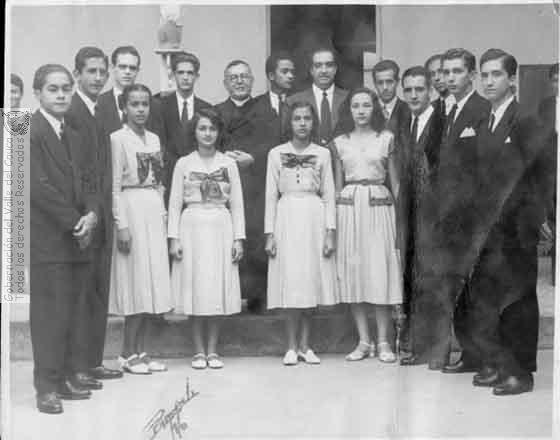 Cuerpo de docentes del Colegio Académico de Buga: airo Cárdenas, Francisco Montoya Payán (Sacerdote), Gerardo Molina Martínez, Roberto Tofiño, Gerardo León Lozada y demás personas por identificar. 1950.