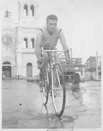 Competencia ciclística en el barrio San Nicolás. En primer plano el ciclista Carlos Vayas. Santiago de Cali, 1952.