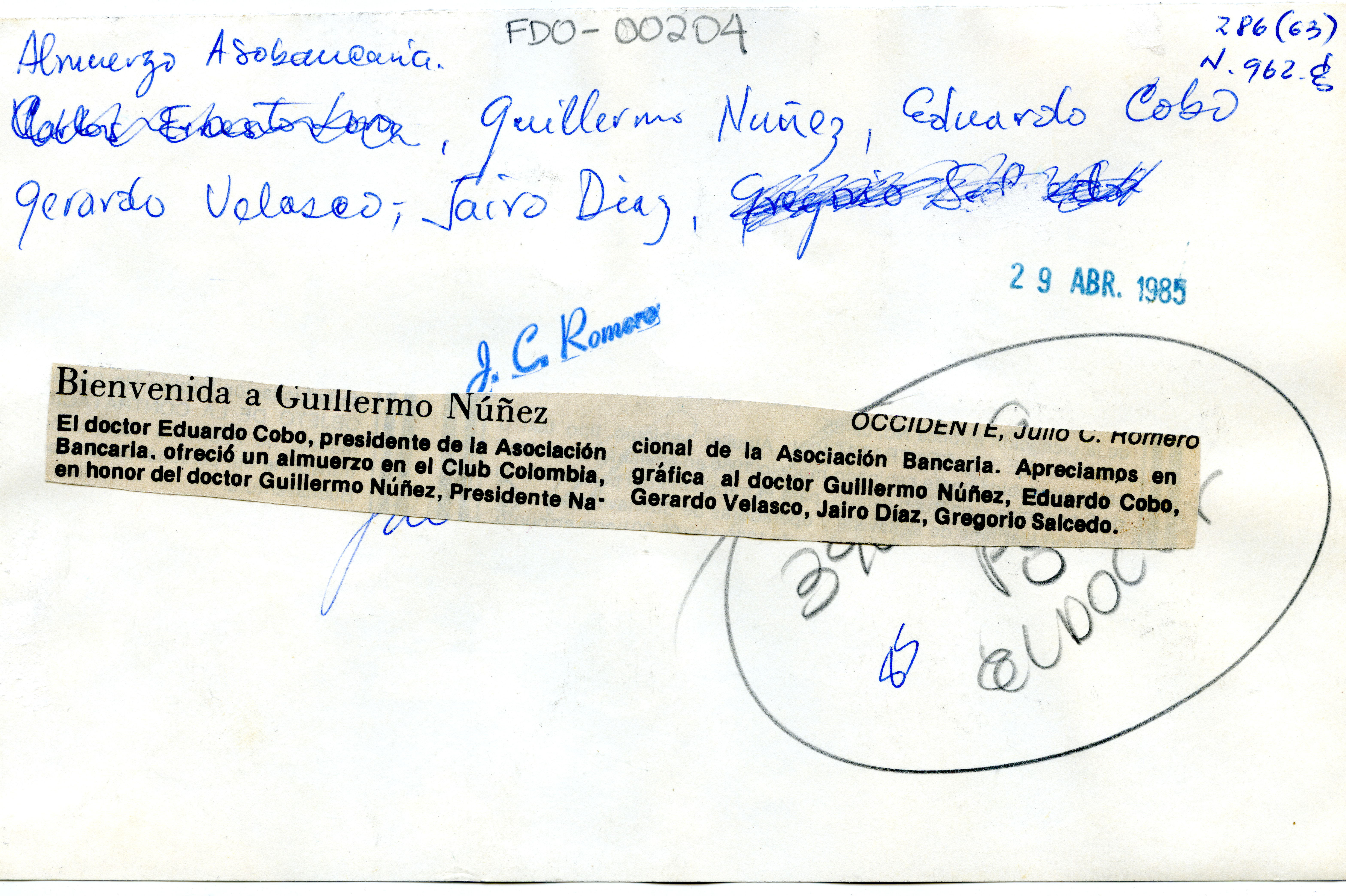 El doctor Eduardo Cobo, Presidente de la Asociación Bancaria, ofreció un almuerzo en el Club Colombia, en honor del doctor Guillermo Núñez, Presidente Nacional de la Asociación Bancaria. El Archivo del Patrimonio Fotográfico y Fílmico del Valle del Cauca es responsabilidad de la Biblioteca Departamental del Valle Jorge Garcés Borrero, por convenio de cooperación suscrito con la Secretaria del Cultura Departamental, con el fin de aunar esfuerzos para su conservación, preservación y divulgación del Archivo entre la comunidad Vallecaucana, especialmente entre los estudiantes e investigadores que visitan la Biblioteca, propiciando el uso y consulta permanente. La universidad Icesi es un colaborador en el proceso de difusión, facilitando la tecnología que permite la consulta de las imágenes.