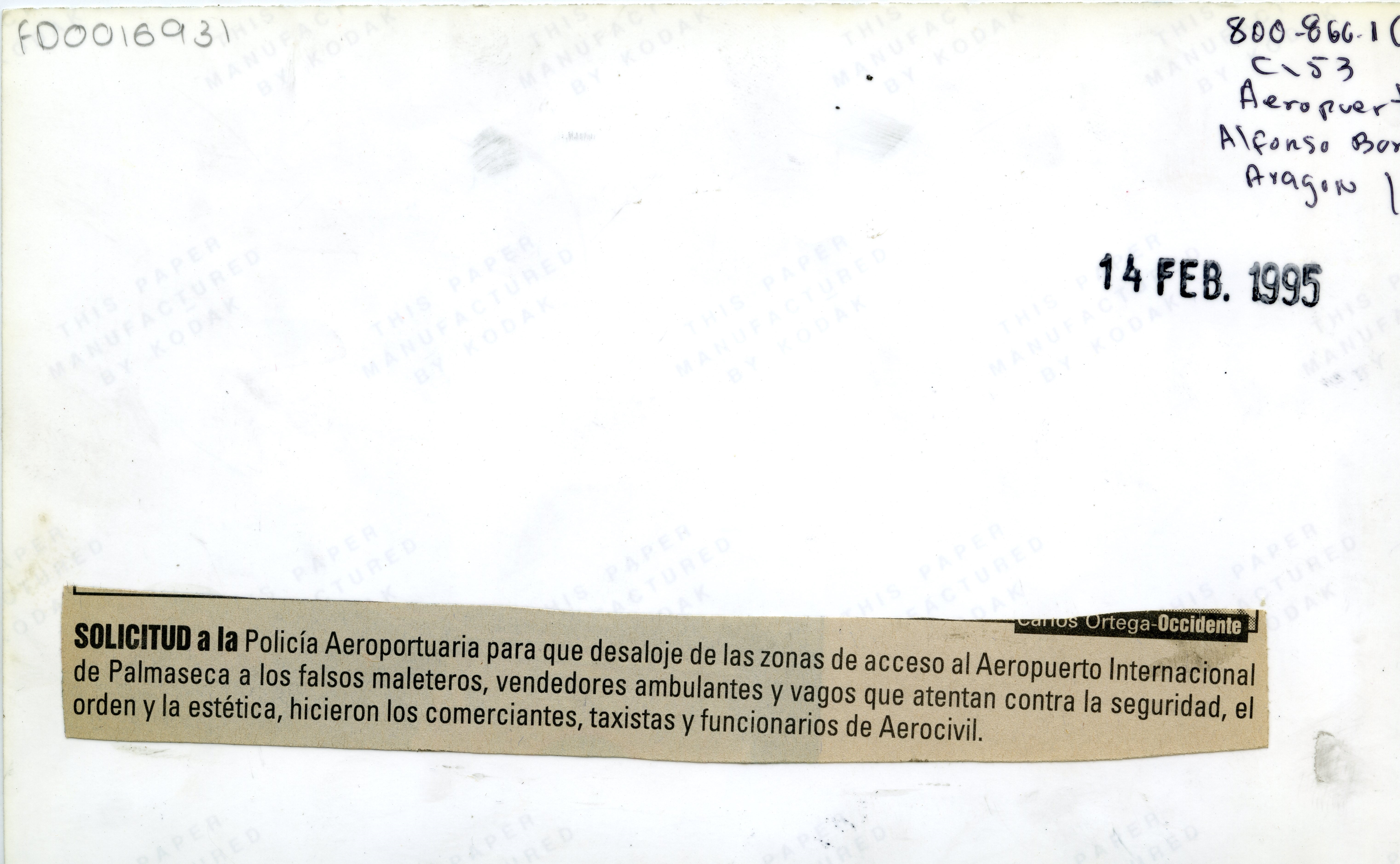 Al reverso de la fotografía se anexa recorte: "Solicitud a la Policía Aeroportuaria para que desaloje de las zonas de acceso al Aeropuerto Internacional de Palmaseca a los falsos maleteros, vendedores ambulantes y vagos que atentan contra la seguridad, el orden y la estética, hicieron los comerciantes, taxistas y funcionarios de Aerocivil."