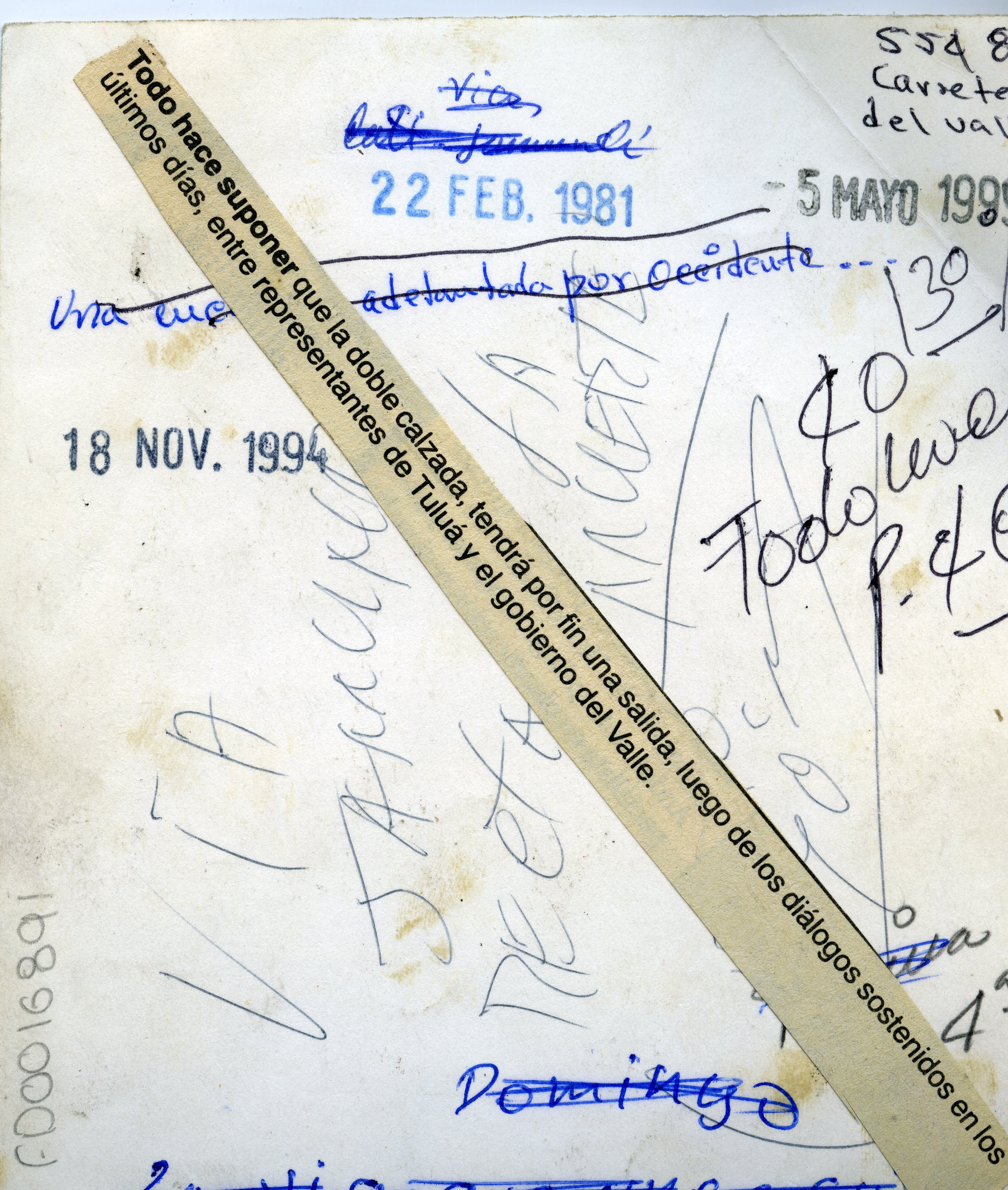 Al reverso de la fotografía se anexa un recorte de prensa: "Todo hace suponer que la doble calzada, tendrá por fin una salida, luego de los diálogos sostenidos en los últimos días, entre representantes de Tulúa y el gobierno del Valle."