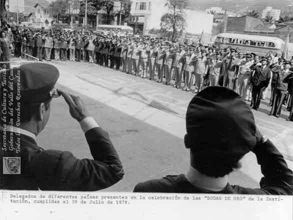 Ceremonia ofrecida por el Cuerpo de Bomberos Volunarios de Cali en las bodas de oro de la institución el 10 de julio de 1977 en el Cuartel Central de la Avenida las Américas. Al acto asistieron delegaciones de diferentes paises. Cali. 1977.