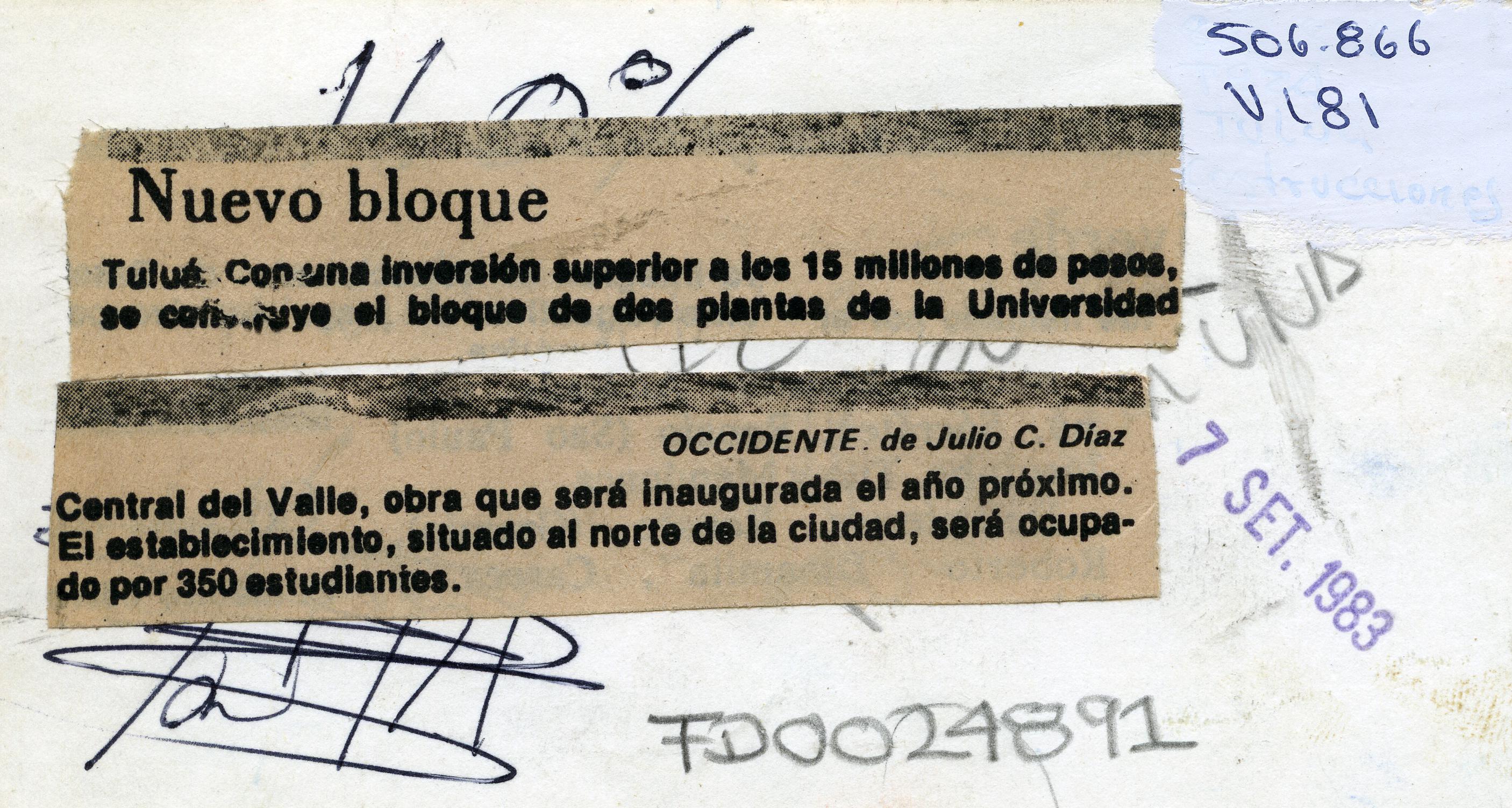 | dc.description.abstract | Al reverso de la fotografía se anexa recorte: Tuluá, con una inversión superior a los 16 millones de pesos, se construye el bloque de dos plantas de la Universidad Central del Valle, obra que será inaugurada el año próximo. El establecimiento, situado al norter de la ciudad, será ocupado por 350 estudiantes | spa |