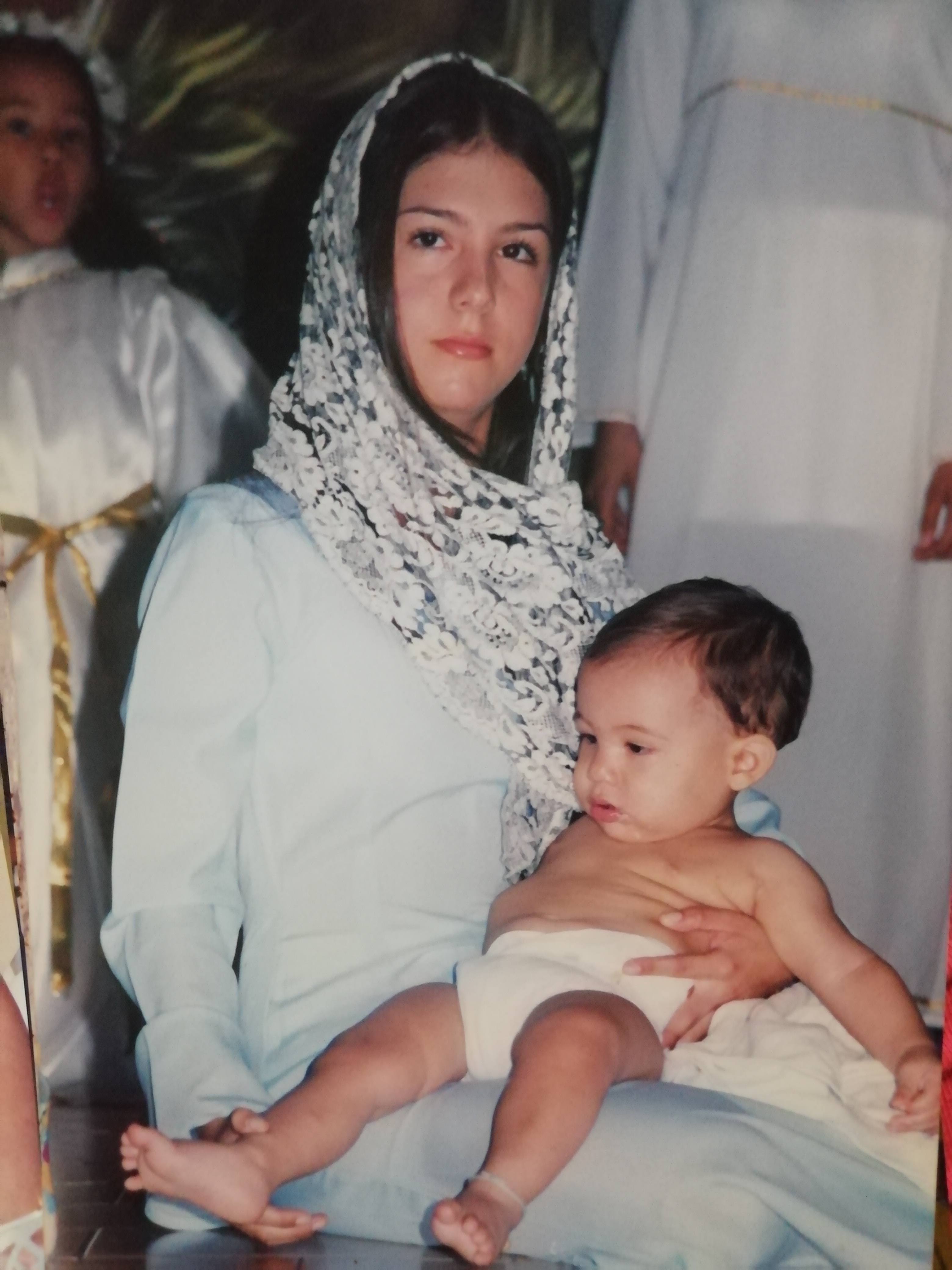 Plano medio de madre con su hijo en la iglesia, se evidencia monaguillos en la parte de atras