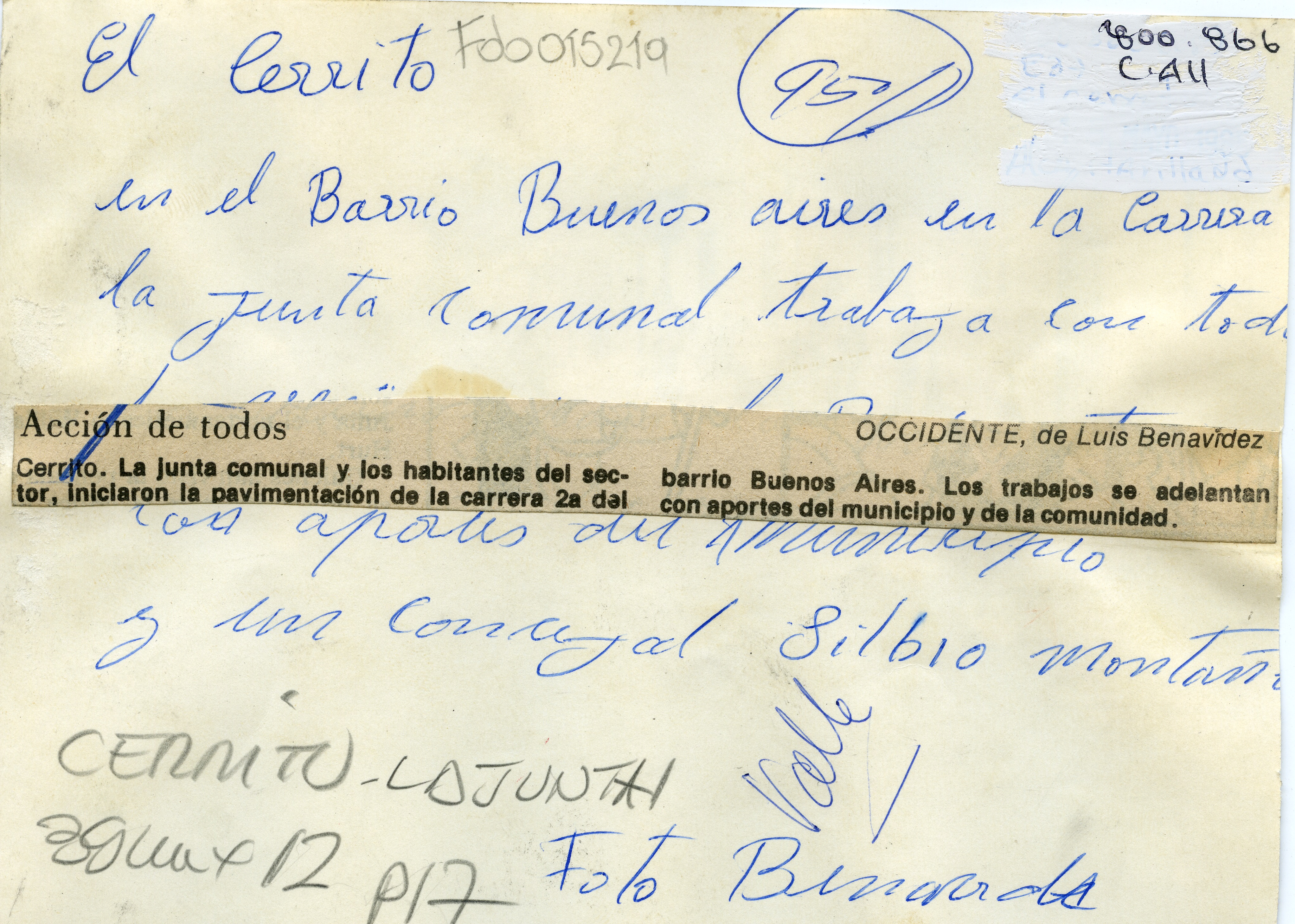 Pavimentación de la vía. Vecinos aportan la mano de obra Pavimentación de la carrera 2a del barrio Buenos Aires. Se aprecia habitantes del sector trabajando en dicha labor. Al reverso de la fotografía se anexa el pie de foto del periódico: "Acción de todos, Cerrito. La junta de acción comunal y los habitantes del sector, iniciaron la pavimentación de la carrera 2a del barrio Buenos Aires. Los trabajos se adelantan con aportes del municipio y de la comunidad".