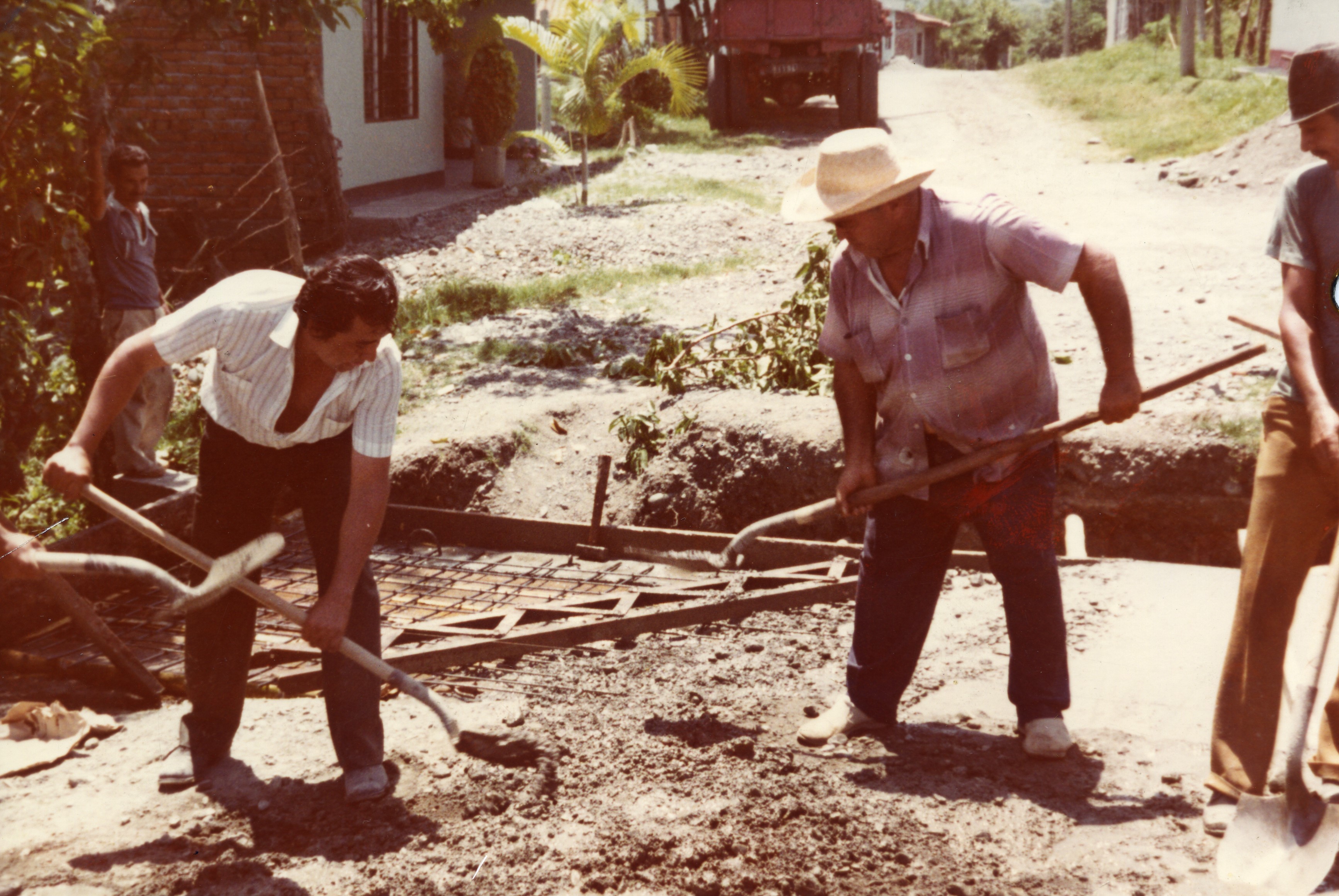En la fotografía con las palas el Alcalde, Norberto Pérez Gonzáles y Secretario de Gobierno, Hugo Caycedo Posso, en recostrucción de puente. Al reverso de la fotografía se anexa recorte:"Alcalde y Secretario de gobierno de Andalucía, Norberto Pérez Gonzáles y Hugo Caycedo Posso, en "plena acción". reconstruyendo un puente de la carrera 3 entre c.16 y 17. Andalucía Alcantarillado. El alcalde, Norberto Pérez González, y el secretario de Gobierno, Hugo Caicedo Posso, arrojan mezcla sobre el puente que se reconstruyó en la carrera 3a con calles 16 y 17. Ellos son hombres de pica y pala, cuando de obras de servicio comunitario se trata".