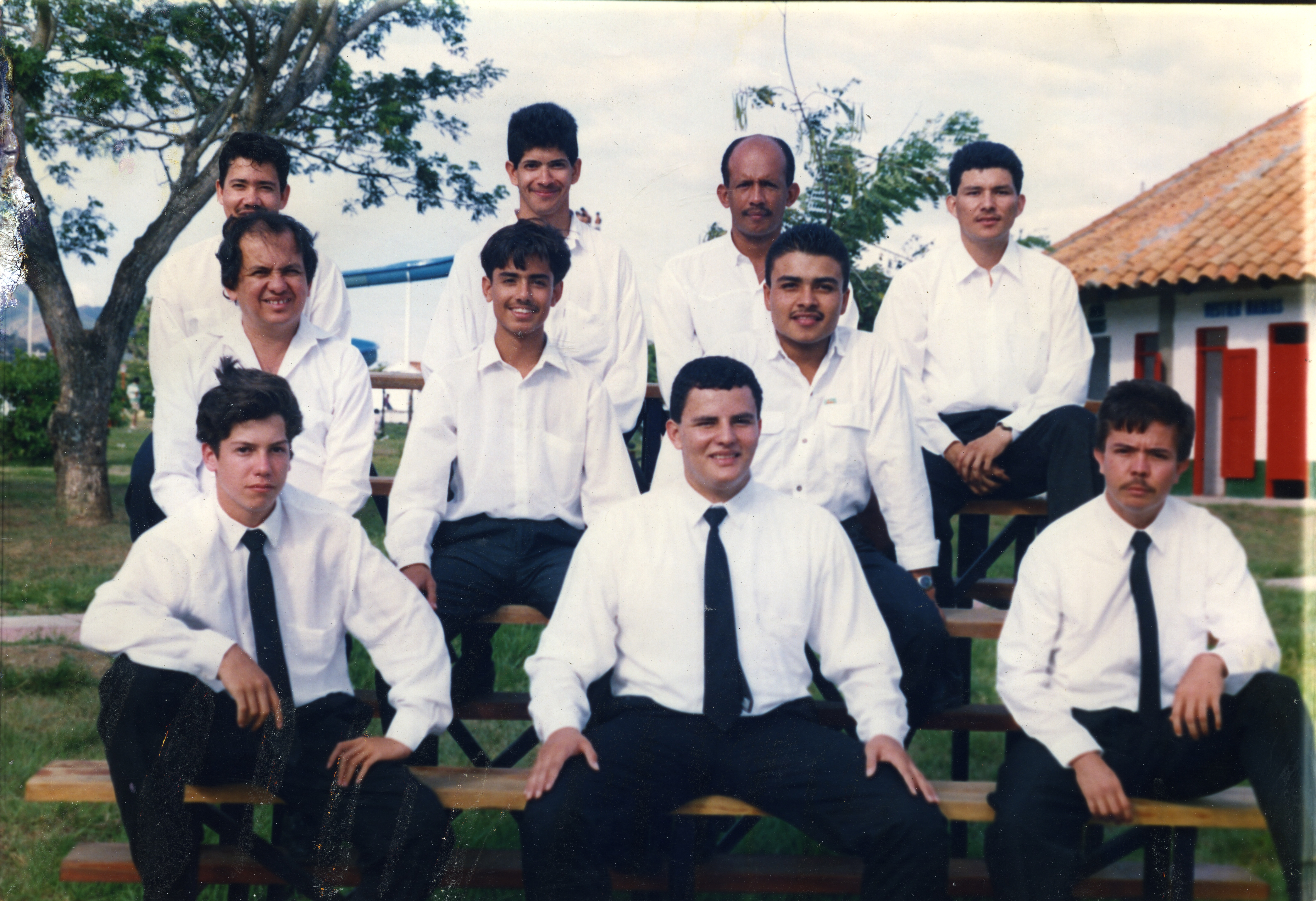 Integrantes Orquesta Kaoba, vestidos de camisa blanca y pantalón negro posando para la cámara. Al reverso de la fotografía se anexa recorte: La nueva orquesta roldanillense, Kaoba será la encargada de iniciar las fiestas populares en este municipio del norte del Valle